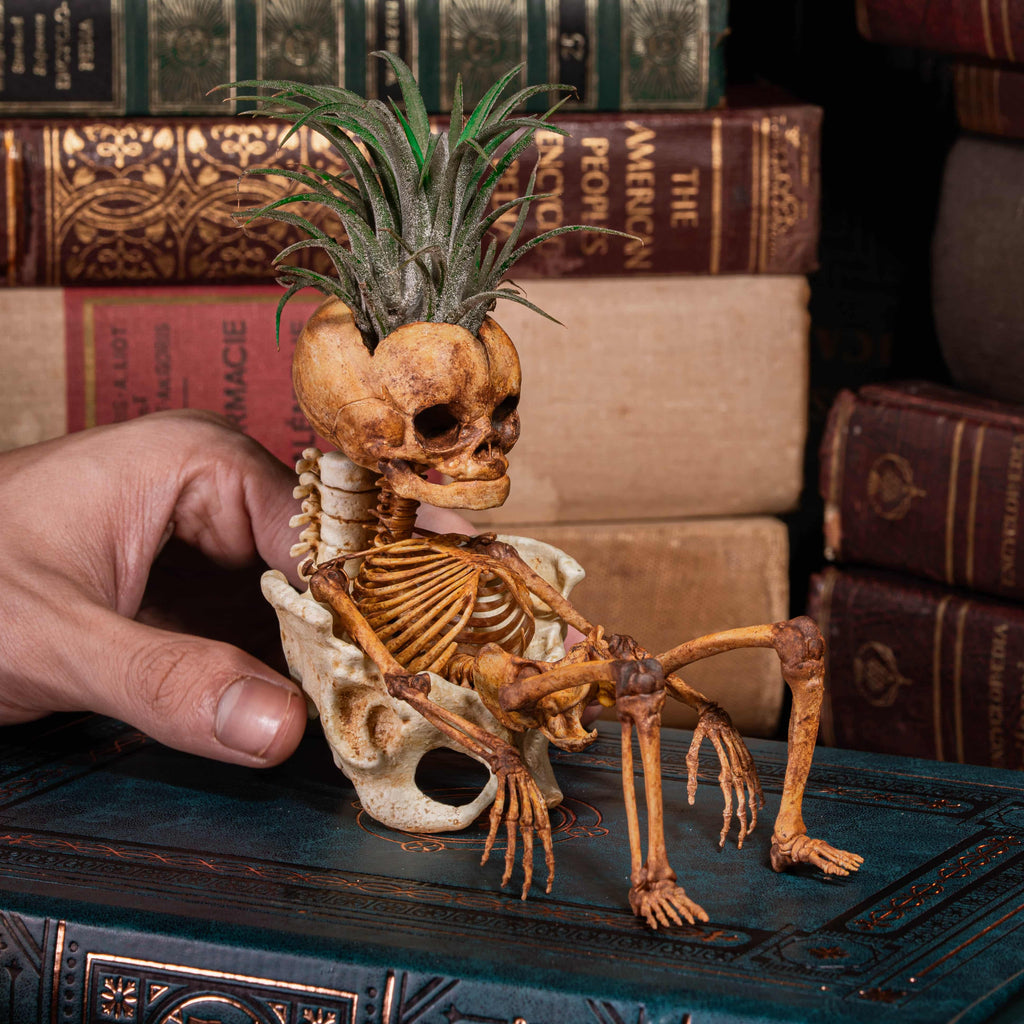 A surreal fusion of anatomical art and functional decor — this 3D printed Baby Fetus Skeleton doubles as an Air Plant Holder. Designed with a hollowed skull cradle to house small air plants, it brings an eerie yet elegant touch to gothic interiors and curiosity cabinets. Perfect for collectors of oddities, lovers of macabre symbolism, or anyone seeking a statement planter that bridges science and dark aesthetics.