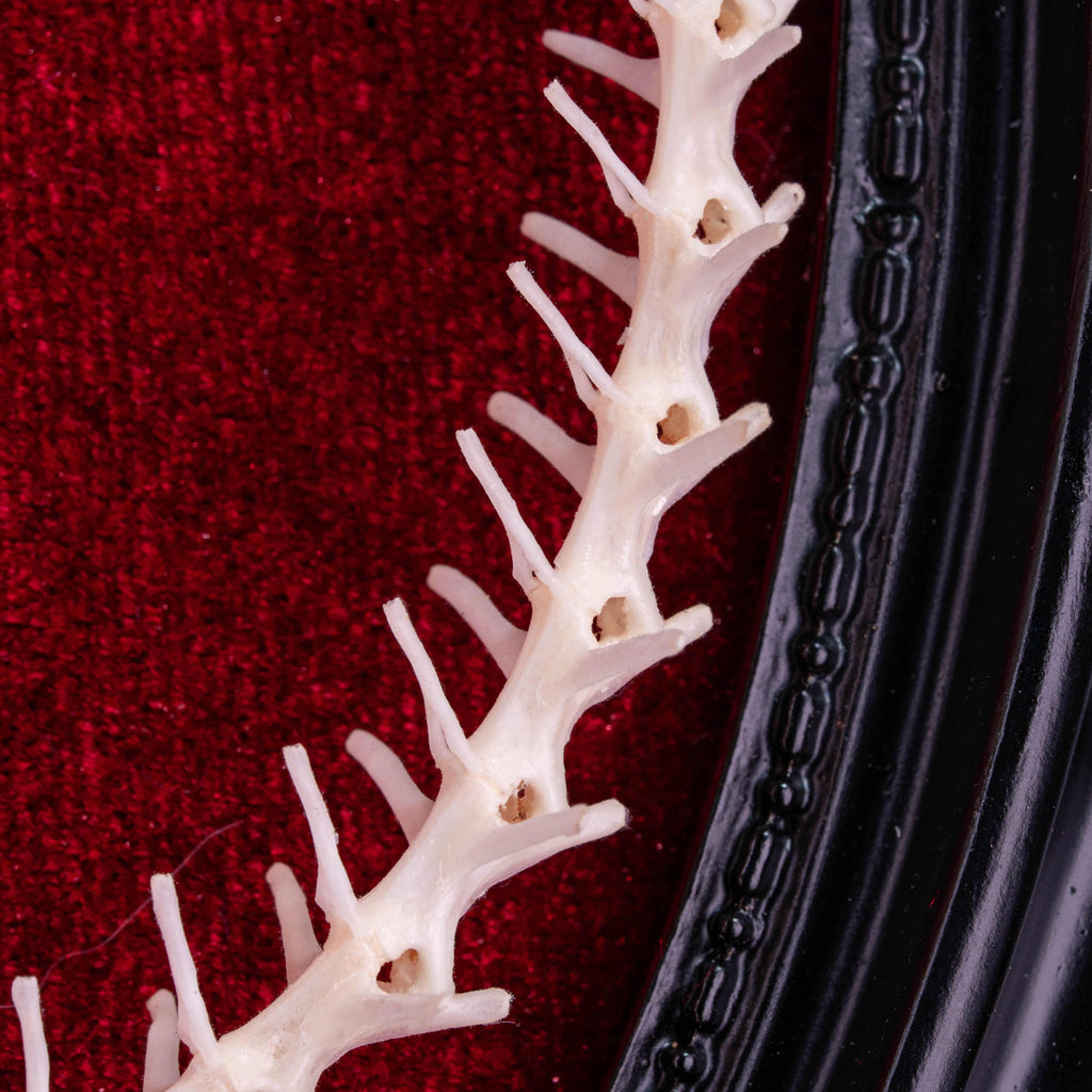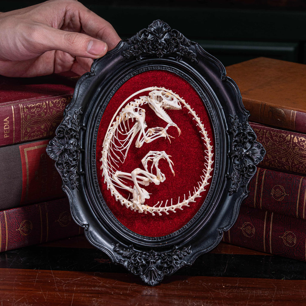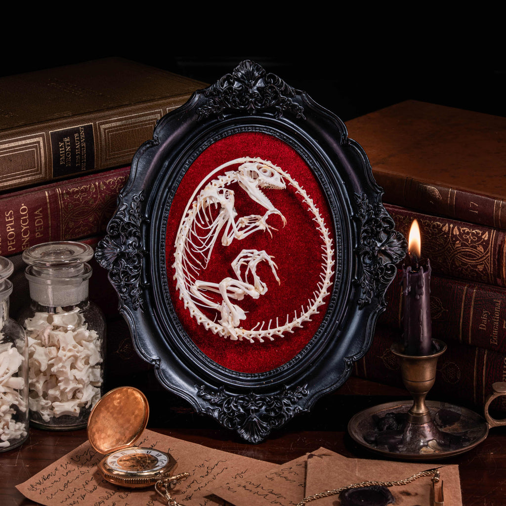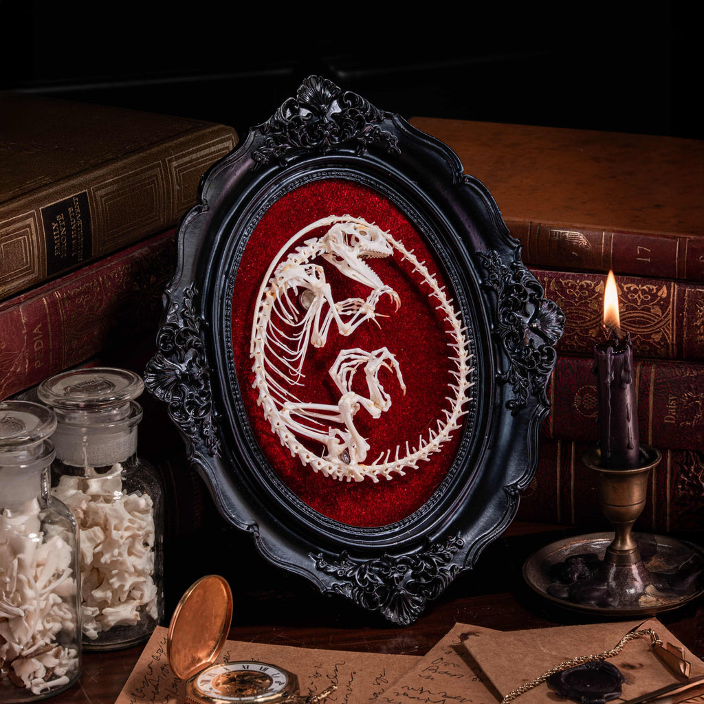 This is not a dinosaur fossil — but it looks just like one. Crafted from a real Butterfly Agama (Leiolepis sp.), the skeleton has been carefully articulated into the curled form of a baby dinosaur skeleton fossil. Resting on a deep red velvet background within a black Victorian-style frame, it combines reptile anatomy with prehistoric illusion, making a striking gothic display piece.