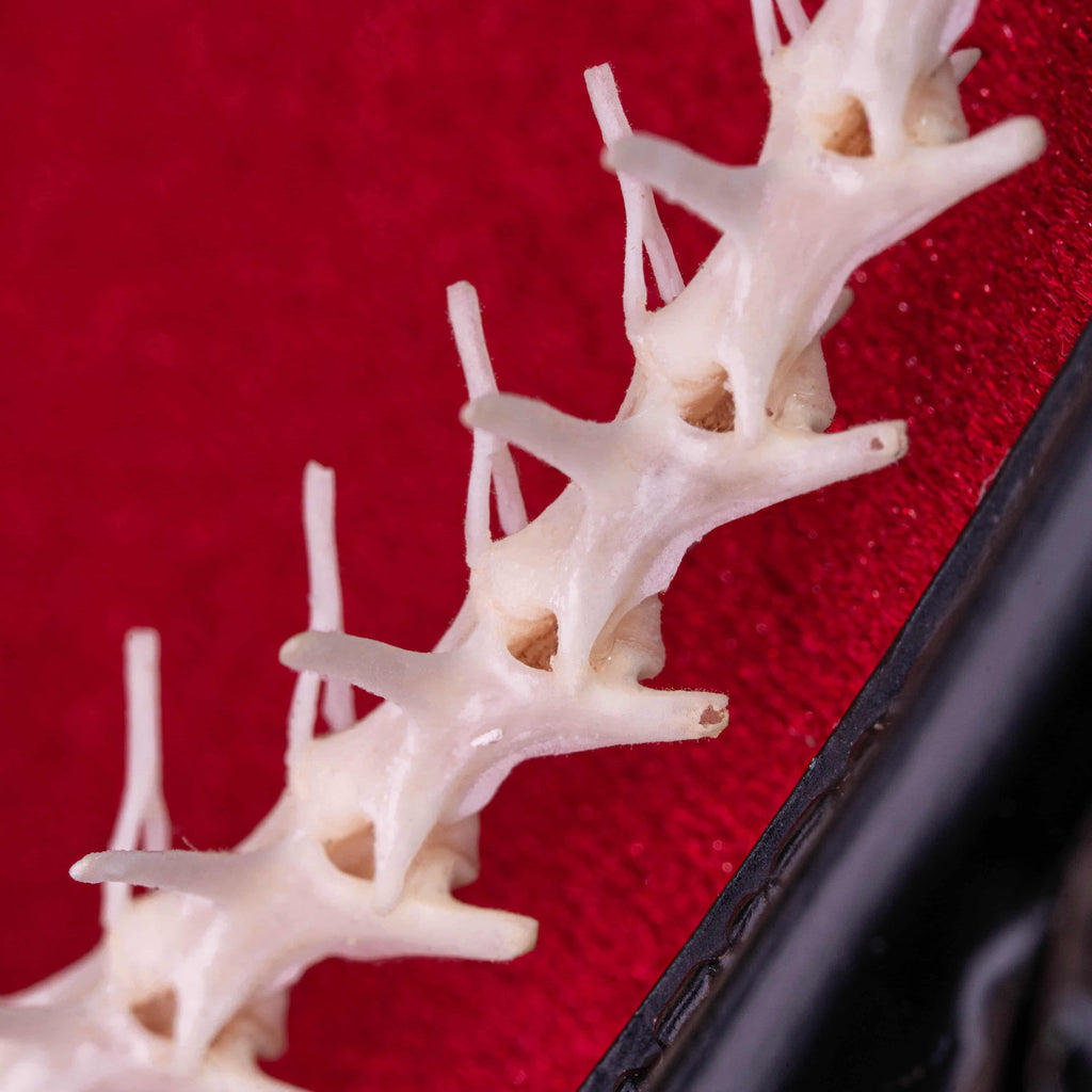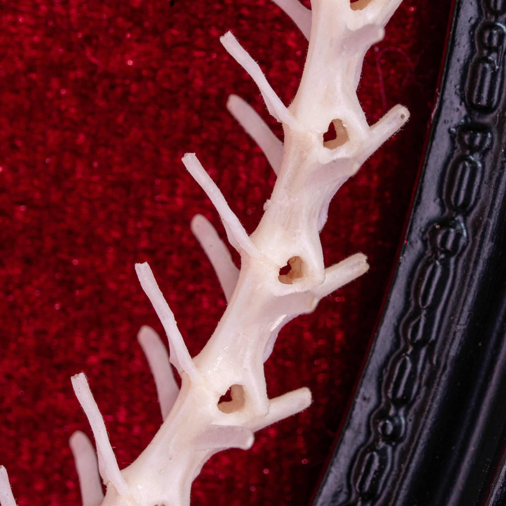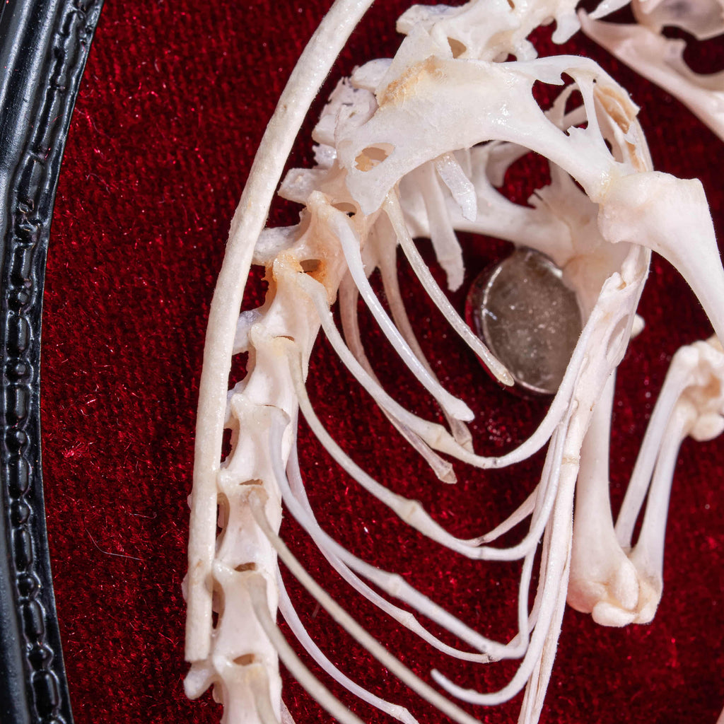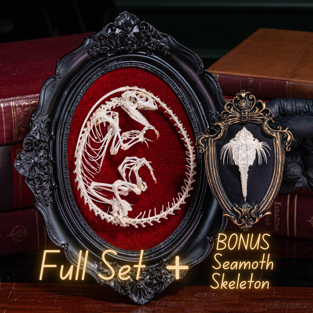 This is not a dinosaur fossil — but it looks just like one. Crafted from a real Butterfly Agama (Leiolepis sp.), the skeleton has been carefully articulated into the curled form of a baby dinosaur skeleton fossil. Resting on a deep red velvet background within a black Victorian-style frame, it combines reptile anatomy with prehistoric illusion, making a striking gothic display piece.