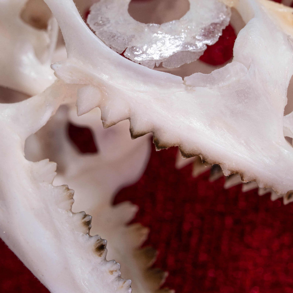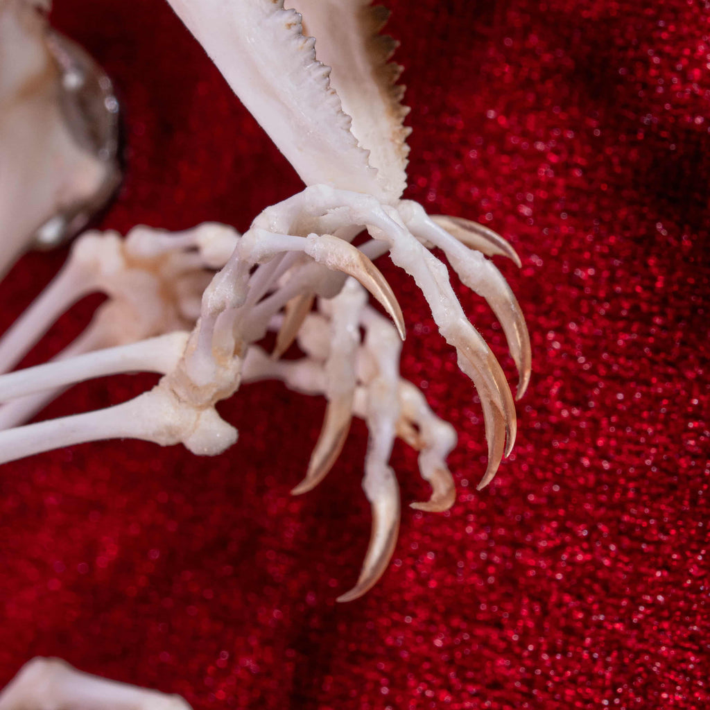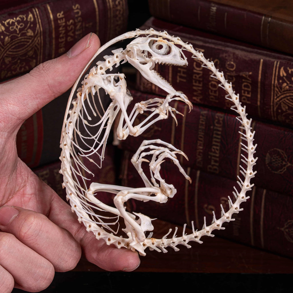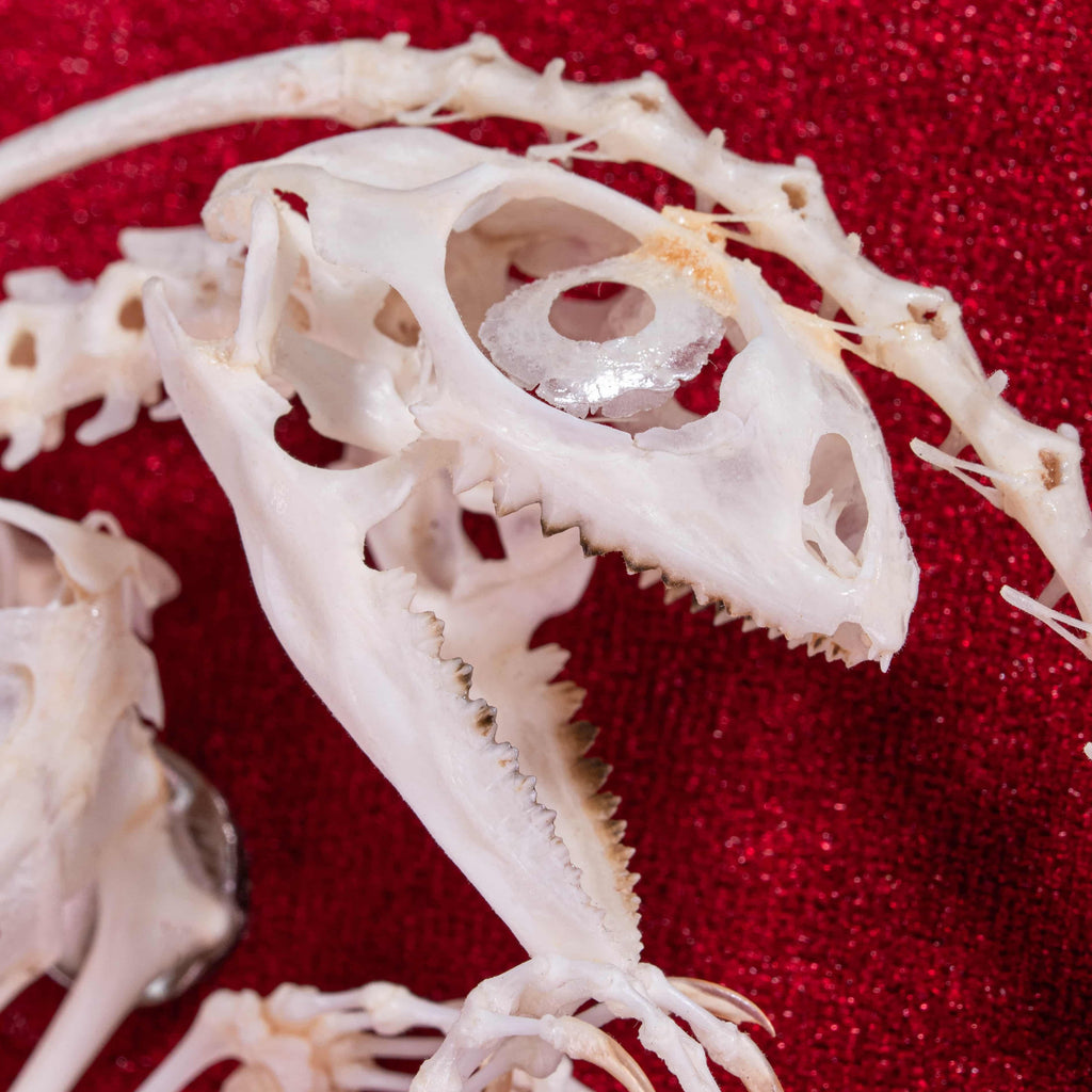 This is not a dinosaur fossil — but it looks just like one. Crafted from a real Butterfly Agama (Leiolepis sp.), the skeleton has been carefully articulated into the curled form of a baby dinosaur skeleton fossil. Resting on a deep red velvet background within a black Victorian-style frame, it combines reptile anatomy with prehistoric illusion, making a striking gothic display piece.