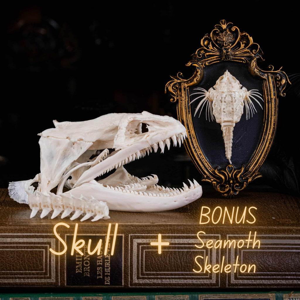 Halloween gift for oddities, bones and skeletons collector, real animal skull and skeleton, fish skeleton taxidermy, monsterfish skull and bone collectibles, museum anatomy specimen, Gothic decoration