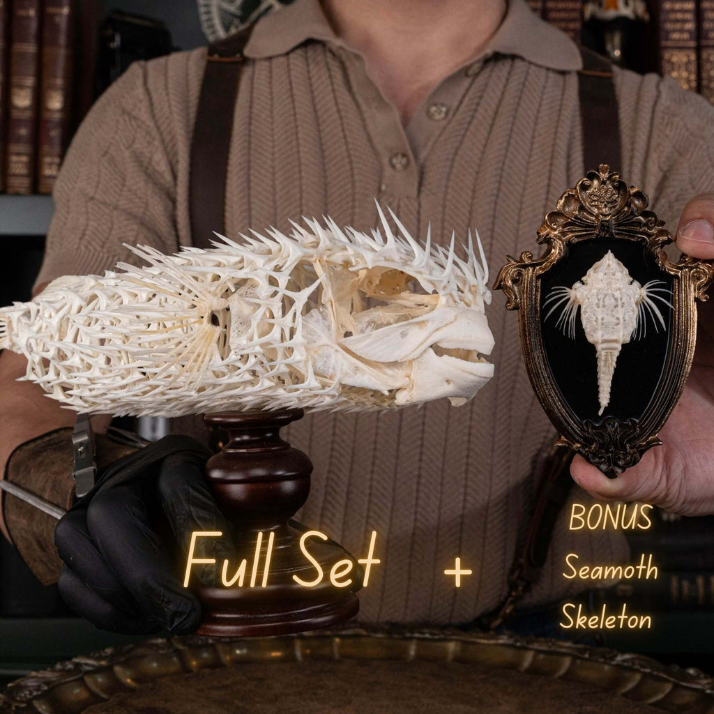 Halloween gift for oddities, bones and skeletons collector, real animal skull and skeleton, porcupinefish taxidermy, pufferfish skeleton skull and bone collectibles, museum anatomy specimen, Gothic decoration