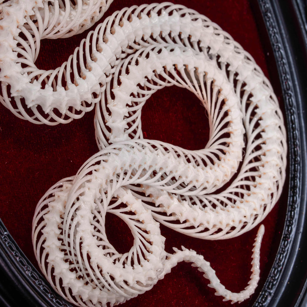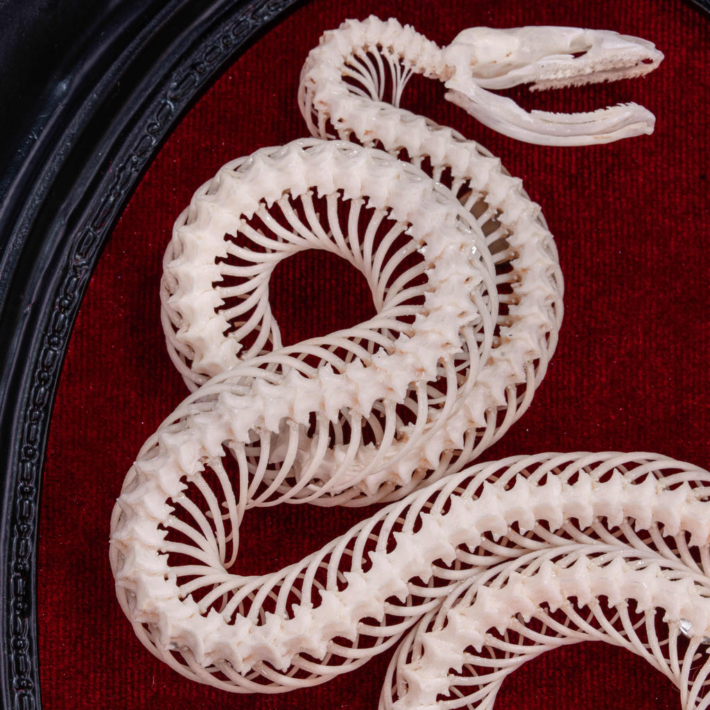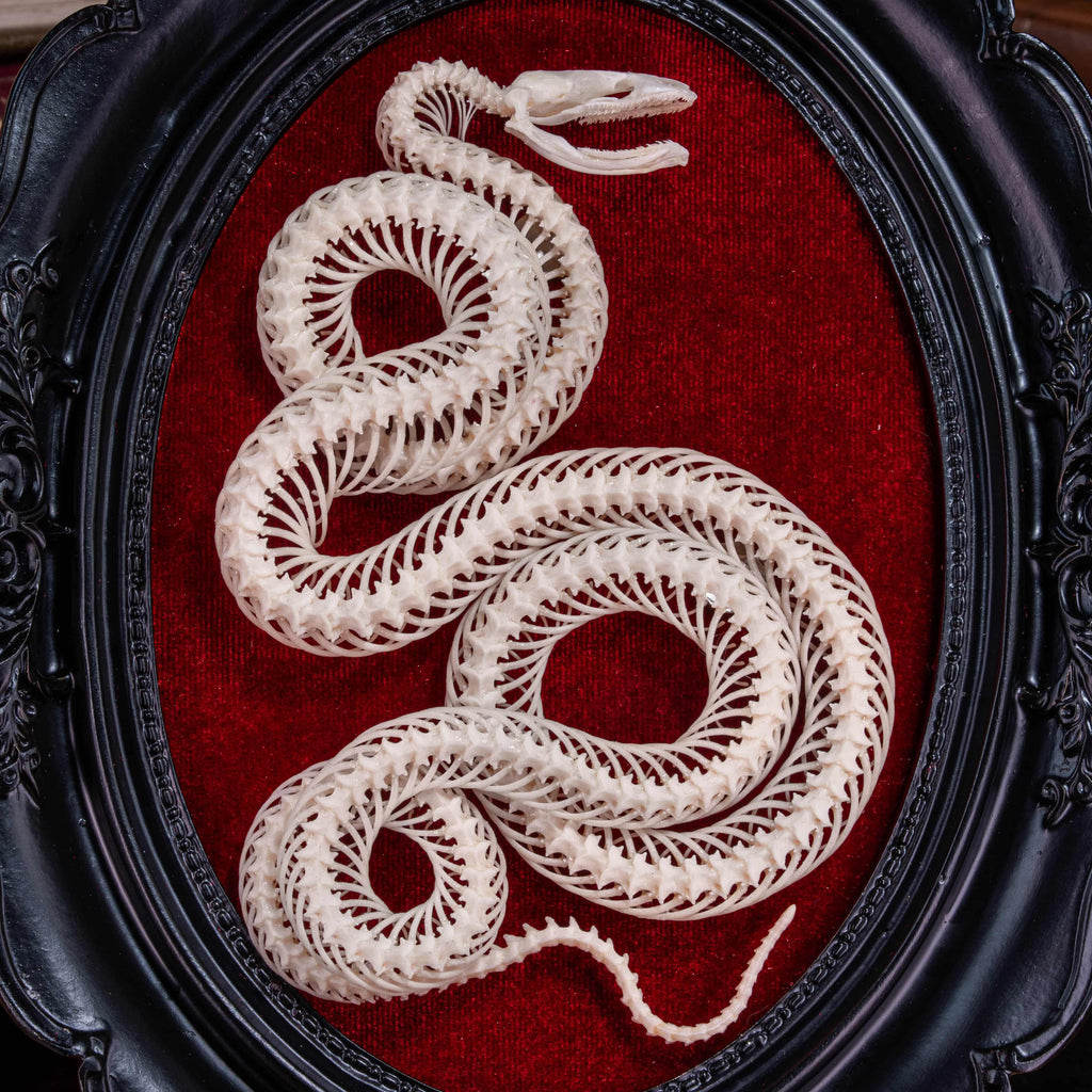 Snakes have long been revered as symbols of wisdom, transformation, and renewal. Shedding their skin, they embody rebirth and spiritual growth. This authentic Water Snake skeleton has been carefully cleaned, articulated, and posed into four elegant coils, representing the four elements of human energy: Physical, Emotional, Mental, and Spiritual. Mounted on a vivid red velvet background within a black Victorian-style Gothic frame, it becomes a dramatic focal point for any interior.