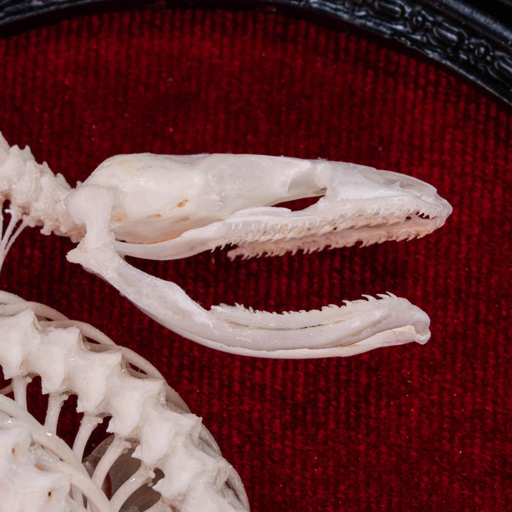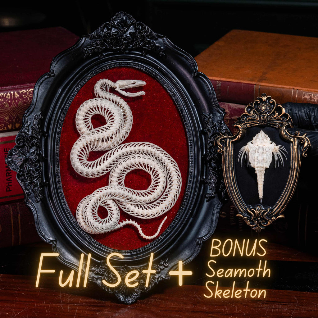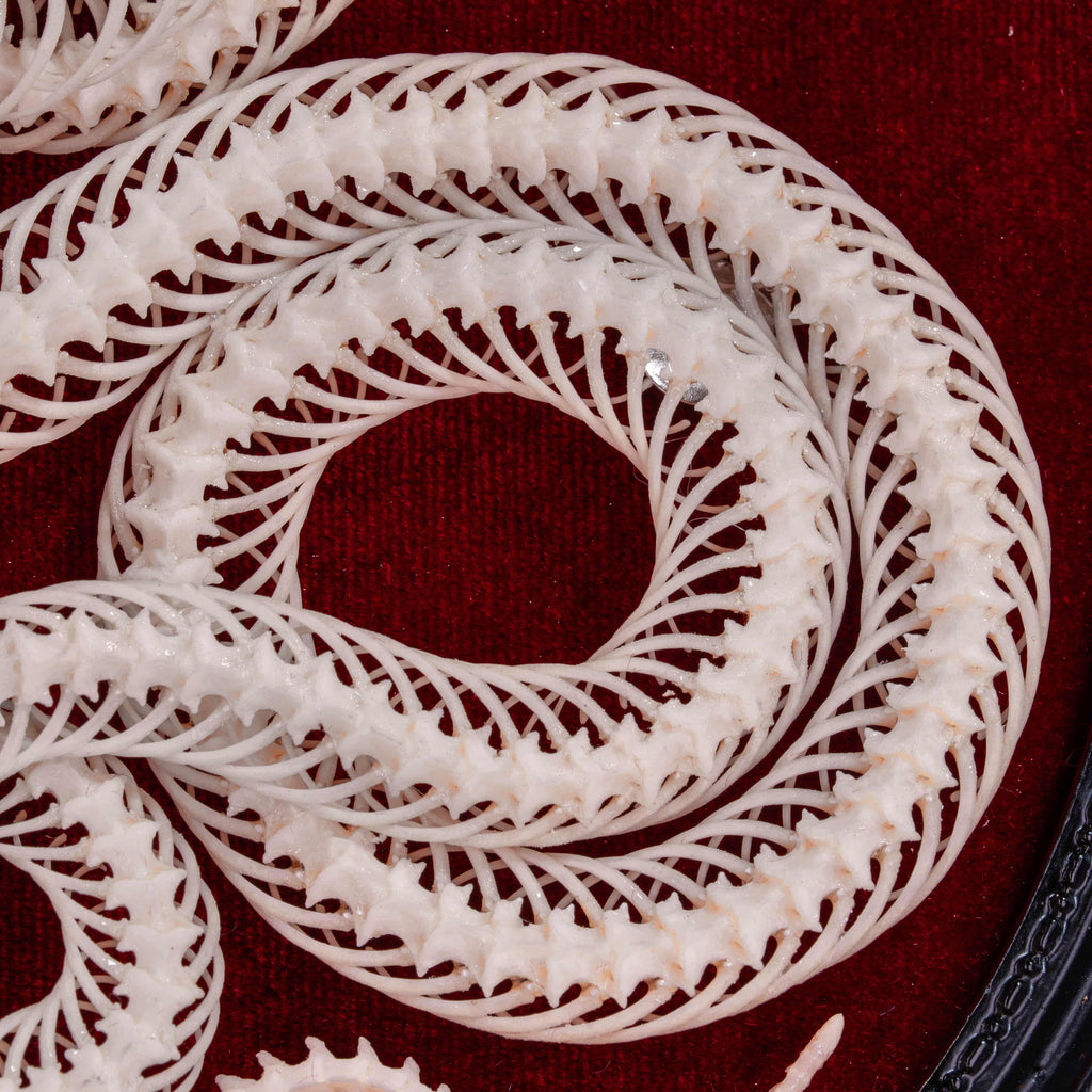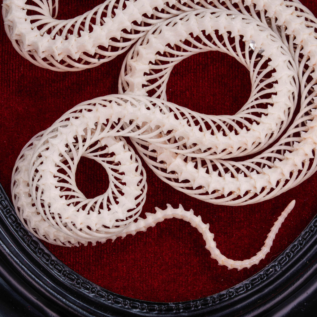 Snakes have long been revered as symbols of wisdom, transformation, and renewal. Shedding their skin, they embody rebirth and spiritual growth. This authentic Water Snake skeleton has been carefully cleaned, articulated, and posed into four elegant coils, representing the four elements of human energy: Physical, Emotional, Mental, and Spiritual. Mounted on a vivid red velvet background within a black Victorian-style Gothic frame, it becomes a dramatic focal point for any interior.
