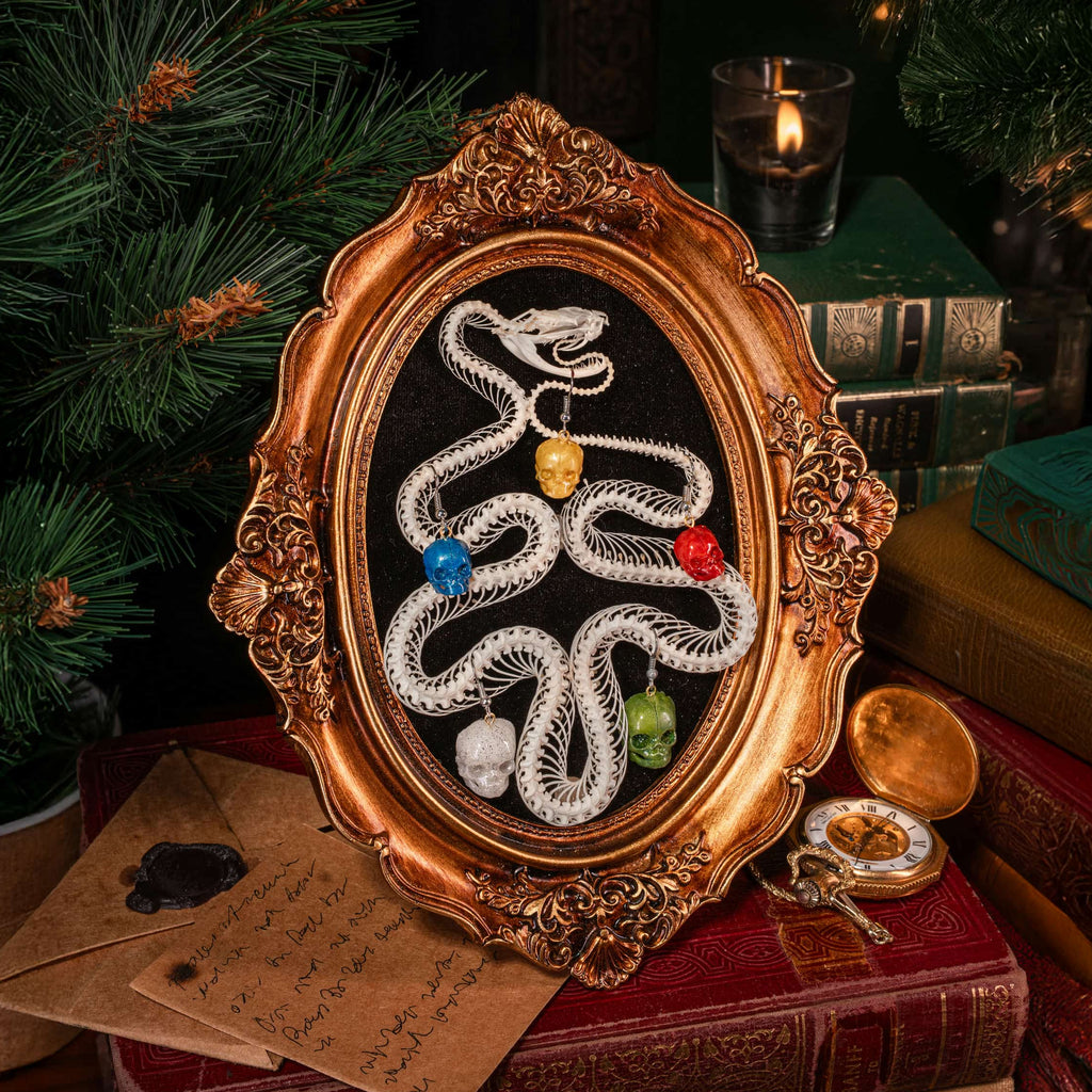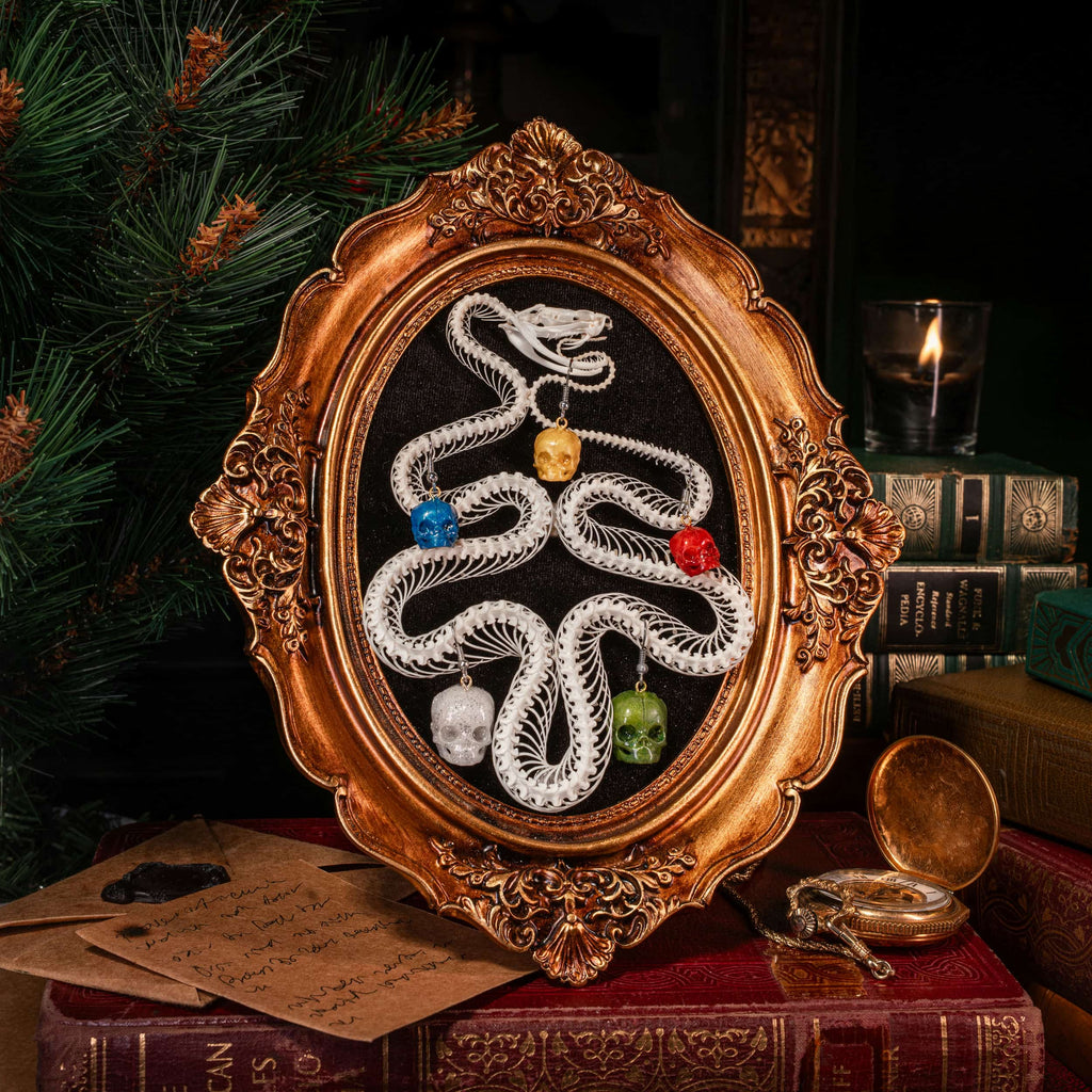Carefully articulated and arranged in the shape of a Christmas tree, the snake’s natural curves form a hauntingly beautiful symbol of rebirth and transformation — accented by colorful skull ornaments in festive tones of red, blue, green, and pearl white.